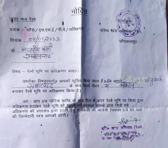 रेलवे मंडल का एक नया कारनामा मध्यप्रदेश में सामने आया है यहां पर रेलवे ने बजरंगबली के नाम से नोटिस जारी कर दिया है मामला मुरैना जिले के सबलगढ़ का है यहां पर ग्यारह मुखी हनुमान मंदिर है यहां के मंदिर में विराजमान बजरंगबली को नोटिस जारी किया गया